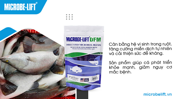 Ngoài ra, việc sử dụng men vi sinh đường ruột Microbe-Lift DFM hỗ trợ cân bằng hệ vi sinh trong ruột, tăng cường miễn dịch tự nhiên và cải thiện sức đề kháng. Sản phẩm giúp cá phát triển khỏe mạnh, giảm nguy cơ mắc bệnh và nâng cao hiệu quả nuôi trồng.