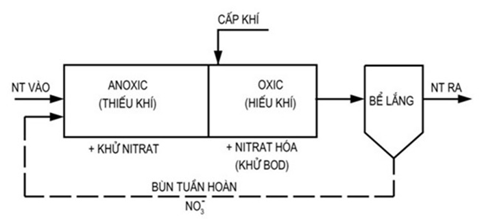 - Xử lý sinh học hiếu khí (Oxic): Là dạng bể sinh học với bùn hoạt tính được xáo trộn hoàn toàn nhờ quá trình sục khí. Tại bể hiếu khí, thường duy trì DO > 3 mg/l để các chất hữu cơ được phân hủy tối ưu. Ngoài các chất hữu cơ được phân hủy tạo thành CO2 và H2O, các chất vô cơ được chuyển hóa đến dạng cuối cùng của chuỗi oxy hóa của các hợp chất vô cơ như Phopho (thành (PO4)3-), lưu huỳnh (thành (SO4)3-), Nitơ (Thành NO3–). Bể hiếu khí thường phải kết hợp với bể lắng sinh học để tách sinh khối bùn ra khỏi nước thải sau xử lý. Bùn tách ra được tuần hoàn 100% về bể thiếu khí (Anoxic), hoặc được xả bỏ lượng bùn dư trong hệ thống.