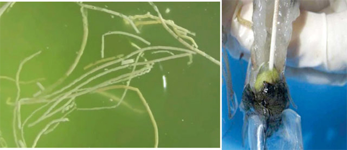 Nhớt bạt cũng là nơi cư trú của nhiều vi khuẩn, ký sinh trùng và cả virus, tiềm ẩn nhiều mầm bệnh nguy hiểm khi tôm ăn nhầm. Trong đó đáng lo ngại nhất là các vi khuẩn tấn công đường ruột, điển hình loài Vibrio spp gây bệnh như phân trắng, khó điều trị, năng suất thấp, nặng có thể gây chết tôm hàng loạt.