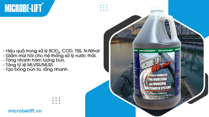 Microbe-Lift IND giúp tăng nhanh hàm lượng bùn, tăng tỷ lệ MLVSS/MLSS, tạo bông bùn to, lắng nhanh, nước sau lắng trong. Sản phẩm còn chứa các chủng vi khuẩn như Rhodopseudomonas Palustris, Bacillus Amyloliquefaciens, Bacillus Licheniformis, Bacillus Subtilis, Pseudomonas Citronellolis hoạt động hiệu quả trong điều kiện yếm khí cho quá trình khử Nitrat.