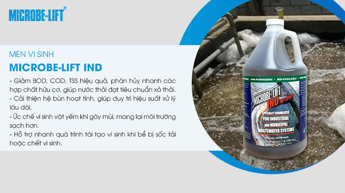 Men vi sinh Microbe-Lift IND là giải pháp toàn diện cho các hệ thống xử lý nước thải có tải lượng hữu cơ cao. Sản phẩm chứa nhiều chủng vi sinh có lợi như Bacillus Licheniformis, Bacillus Subtilis, Pseudomonas Citronellolis… giúp phân hủy nhanh các hợp chất hữu cơ khó xử lý, giảm BOD, COD, TSS và ổn định hoạt động của bể sinh học. Ưu điểm nổi bật của men là: