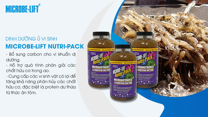 - Kết hợp sử dụng dinh dưỡng ủ vi sinh Nutri-Pack: Dinh dưỡng ủ vi sinh Microbe-Lift Nutri-Pack không chỉ bổ sung carbon cho vi khuẩn dị dưỡng mà còn hỗ trợ quá trình phân giải các chất hữu cơ trong ao. Ngoài ra, NutriPack cũng cung cấp các vi sinh vật có lợi để tăng khả năng phân hủy các chất hữu cơ, đặc biệt là protein dư thừa từ thức ăn tôm. Từ đó, bà con có thể giảm sự tích tụ của ammonia trong ao nuôi.