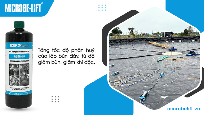 Microbe-Lift AQUA SA chứa các chủng vi sinh hoạt tính mạnh có nhiệm vụ tăng tốc độ phân huỷ của lớp bùn đáy, các chất hữu cơ khó phân huỷ, từ đó giảm bùn, giảm khí độc sinh ra từ bùn đáy có thể gây ảnh hưởng đến tôm.
