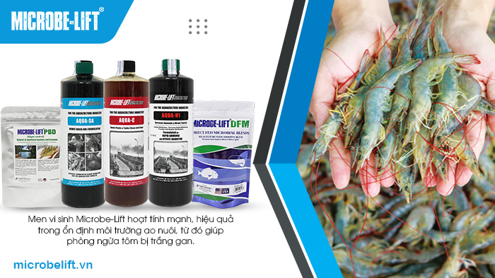 Men vi sinh Microbe-Lift hoạt tính mạnh, hiệu quả trong ổn định môi trường ao nuôi, từ đó giúp phòng ngừa tôm bị trắng gan.
