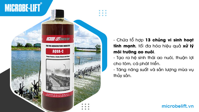 Microbe-Lift AQUA C chứa các chủng vi sinh vật có khả năng phân hủy các chất hữu cơ dư thừa trong nước, giảm thiểu tảo có hại và kiểm soát sự hình thành bùn đáy. Sản phẩm dạng lỏng giúp kích hoạt nhanh, không cần thời gian ngâm ủ, đảm bảo hiệu quả sử dụng tối đa. Sản phẩm chứa các chủng vi khuẩn Bacillus có hoạt tính mạnh như Bacilus Amyloliquefaciens, Bacillus Subtilis, Bacillus Licheniformis và các chủng Clostridium, Desulfovibrio, Pseudomonas,… giúp tạo ra hệ sinh thái ao nuôi, thuận lợi cho tôm.