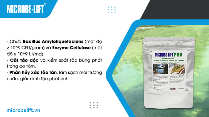 Microbe-Lift PBD là men vi sinh chuyên dụng cho việc cắt tảo độc trong ao nuôi tôm. Sản phẩm được phát triển bởi Ecological Laboratories Inc. (Mỹ) với mục tiêu kiểm soát sự phát triển của các loại tảo có hại trong ao nuôi tôm. Sản phẩm có khả năng cắt các loại tảo độc như tảo lam (Oscillatoria, Microcystic), tảo mắt (Euglenophyta), và tảo giáp (Pyrrophyta). Sản phẩm an toàn cho tôm, không chứa hóa chất, kháng sinh và các chất độc hại.